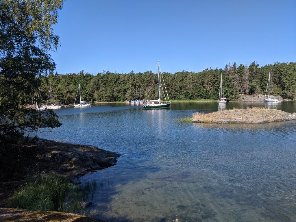 We try to avoid sailing in the rain if we can help it. It was due to rain by mid-day – ergo it needed to be a short sail – a whole 5nm to a perfect all weather anchorage – the kind you snuggle down into – cocooned by trees to the waters edge – Kolnäsviken, Ornö. The next day it was another quick hop to a neighbouring island, Mörtö Bunsö. It is a nature reserve with a natural harbour, and when we arrived there were just 2 boats and a pair of white tailed eagles gliding effortlessly above us – we anchored and a cup of tea and some of Mags’ home baked oat cakes and we enjoyed the peace and quiet ….but to our surprise it just kept filling up and by the end of the day we had 40 boats in there.