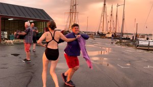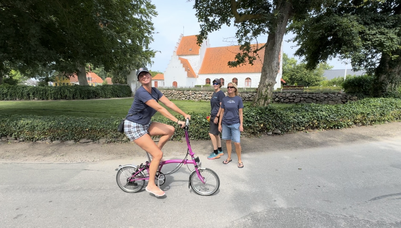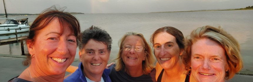 We sailed up to Lyø and were thankful that we could get alongside (there is only one space) as that meant Liz could get off. The idyllic village of Lyø is about a mile away. How could we get Liz there….. on a bike – with me pushing her up the hill. A restorative beer and Liz made it back to the boat just as the rain filled ominous clouds built. There were then some impressive down draughts of wind just prior to the thunderstorm – the deluge came. An eerie light with the setting sun and the rain – it was quite beautiful. A still calm followed as the wind and rain died and a full rainbow shone out. Next thing Casey leapt in for a swim. Only to emerge to find a chap from a Tallship playing his accordion. Which prompted Mags and Casey to dance…. was it a jive, polka or freestyle – no one could quite tell but it was hilarious.