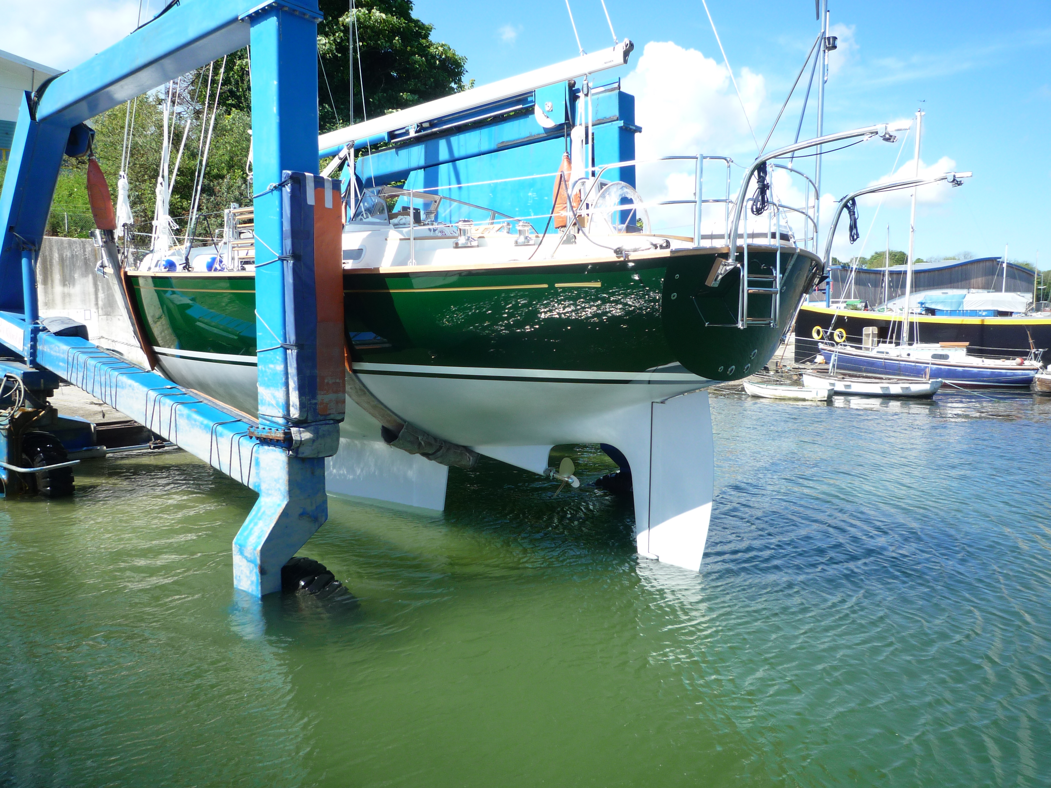 So just 2 years after our sail on Whinchat, our dream had come true and Carra is lowered into the water and is soon tied up.