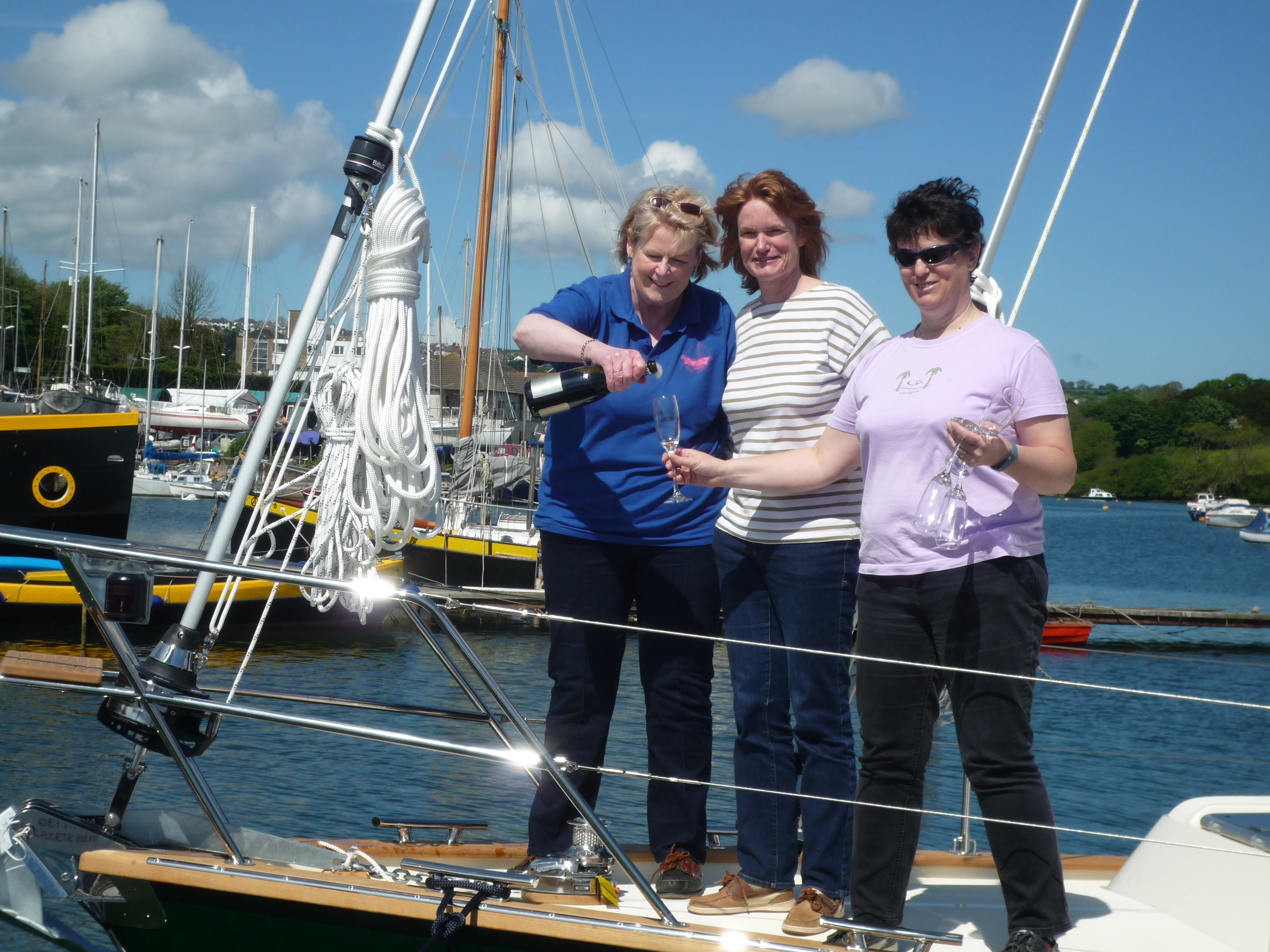 She can only be afloat during HW – so we don’t have too long. Mags, Sue and I clamber onboard, I pop the cork and Sue pours the champagne over her bow as she Sue names her – we all toast Carra. Quick photo shoot and we all leap off. With Nick at the helm and Simon on board he skillfully maneuvers her off and we watch as she gracefully disappears off to the Marina at Mylor.